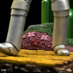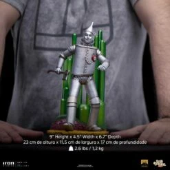 In the enchanted land of Oz, a brave girl discovers a mysterious metallic figure on the edge of the yellow brick road. Hidden by trees and bushes, a man entirely made of tin and completely rusted murmurs in agony for his oil can. After freeing him from his rust prison and helping him get back to moving and speaking, he tells her his sad story, that he felt empty inside because the Tinsmith that made his body forgot to add a heart. He then joins the young Dorothy in the search for the enigmatic wizard, that can help her get back to her home in Kansas, and maybe give a heart to her new friend. Iron Studios bring the statue of the classic “Tin Man Deluxe – The Wizard of Oz – Art Scale 1/10”, played by Jack Haley, with his clock ticking on the left side of his chest, wielding his axe and walking over a pedestal of the yellow brick road, with the landscape of the towers from the Emerald City in the background.