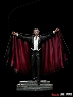 In the border between Transylvania and Wallachia, in the middle of the forest in the Carpathian Mountains, a noble and eccentric aristocratic figure, dressed in a gallant formal suit open its red and black cape like giant wings of a night creature, fixating its hypnotic eyes to feed from the blood of live prey to maintain its power and immortality. Thus, Iron Studios proudly present their statue “Dracula Deluxe – Art Scale 1/10 – Universal Monsters”, with the most famous vampire from fiction, on a diorama pedestal with the staircase steps from its castle and a wild wolf howling by its side, highlighting its power to control the creatures of the night.