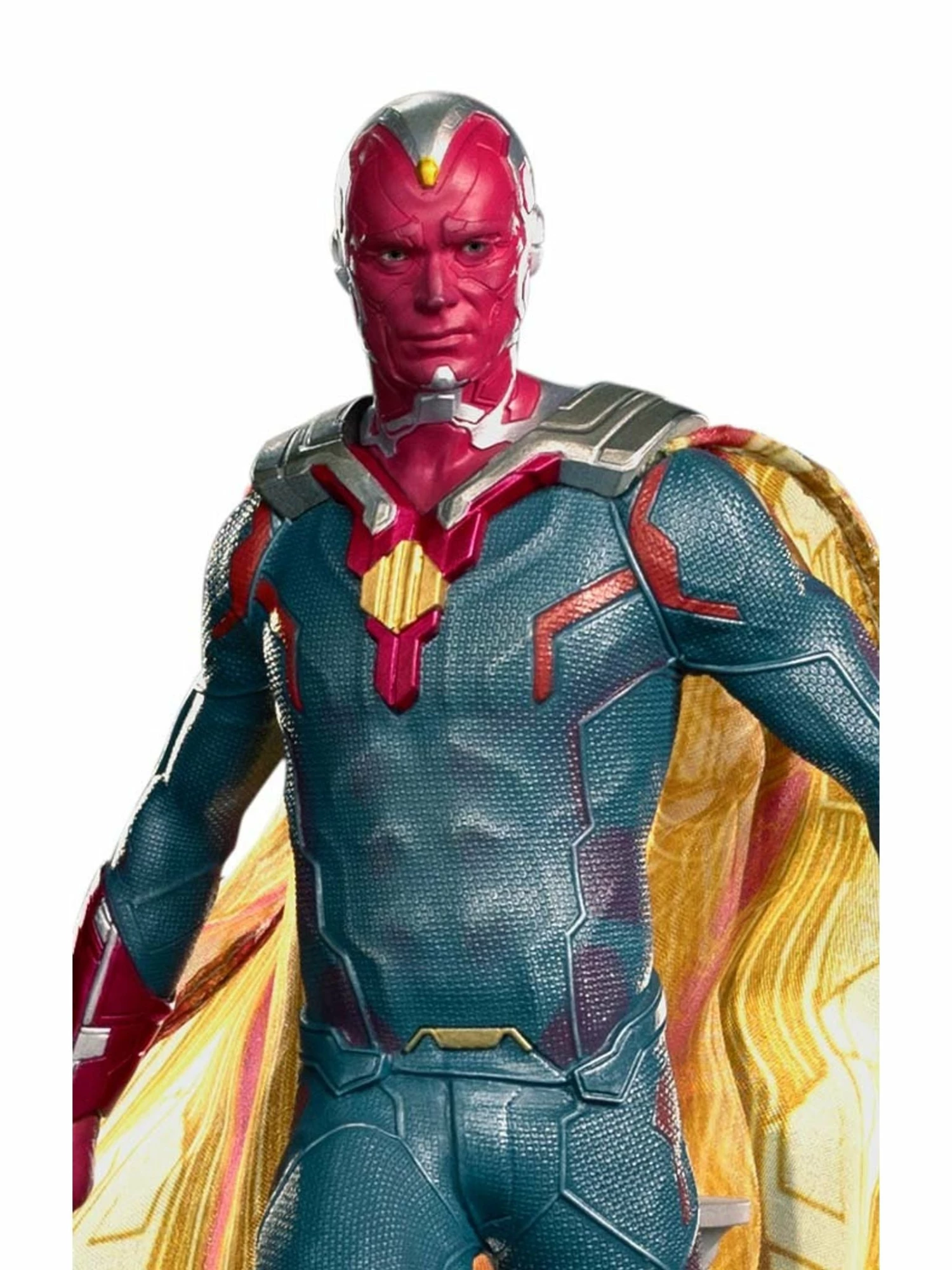 Floating over the debris of an old library, the synthezoid avenger created by the evil robot Ultron and revived by his beloved witch Wanda Maximoff through Chaos Magic, lifts in the air ready to fight to defend his newly created family. He is about to face himself, in his old body’s shape, reconstructed and reactivated by mystical forces, in a new and ghostly all-white version, destitute of feelings or old memories. Based in one of the most memorable scenes from last episode of the Wandavision series from Disney+ channel, Iron Studios present the statue “Vision – Wandavision – BDS Art Scale 1/10″ where the robotic hero fights against his original and corrupted version to defend his beloved wife and children.