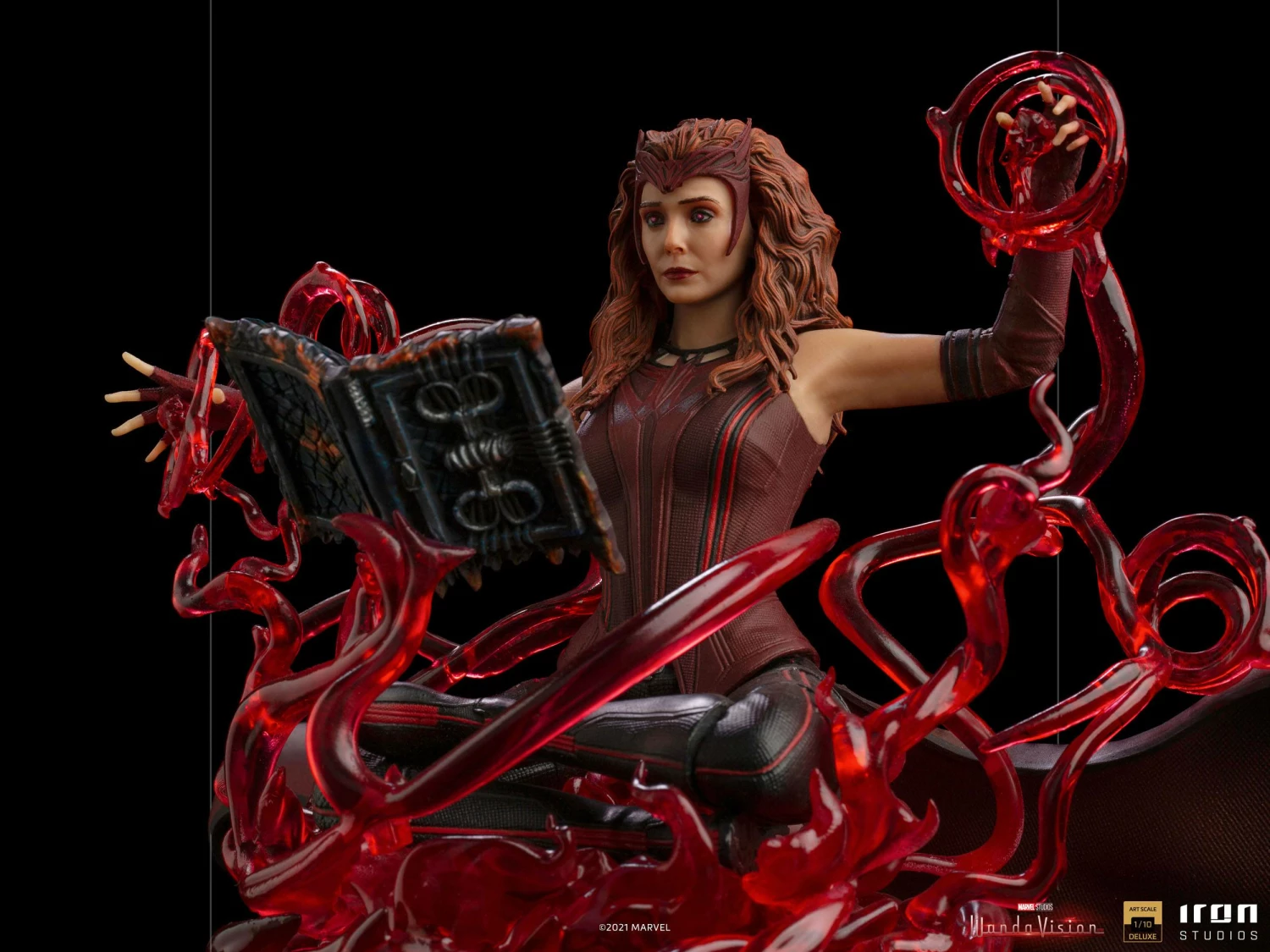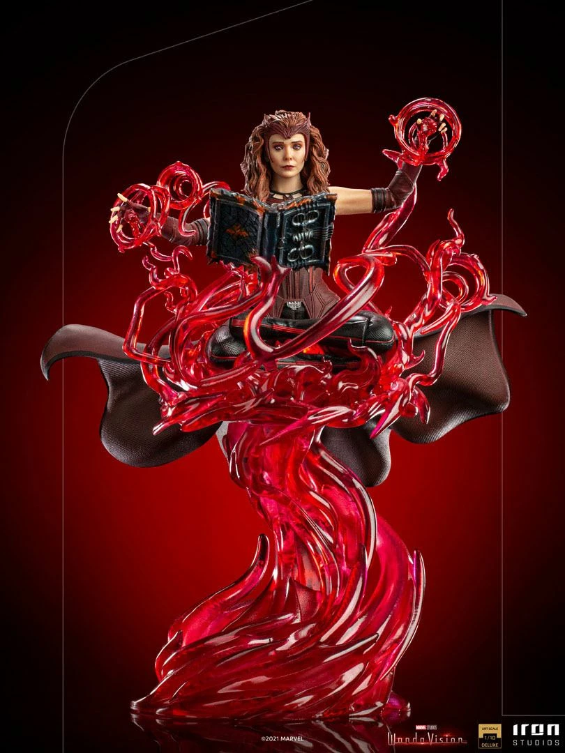 On a translucent base that emulates bands of mystical red energy, the mighty Wanda Maximoff expands all of her power channeling the Chaos Magic, justifying her transformation and being forged as Scarlet Witch. Her soul floats and manipulates the red energy as she reads the Darkhold, an ancient book of spells and powers made of dark matter. This old book contains dark and unimaginable knowledge. Replicating the exciting post-credits scene from the final episode of Disney+`s WandaVision miniseries, Iron Studios presents the “Scarlet Witch Deluxe Art Scale 1/10 – Wandavision” statue.