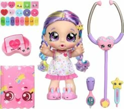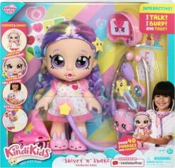 Shiver ‘n’ Shake Rainbow Kate is amazingly interactive with over 40 phases and sounds! But this cute Kindi Kid is not feeling very well. She has caught the Sprinkle-Pox. Pick her up and you will feel her Shiver and shake with a fever, but don’t worry, you have everything you need to heal her and make her better so that she feels “Wobbly Bobbly Great”! Use Kate’s six different Shopkin accessories to give her a check up and see what’s wrong.