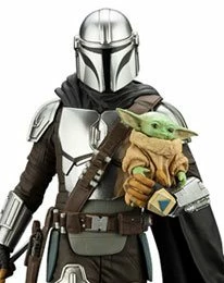 This statue portrays the Mandalorian holding a Beskar spear in his right hand, and Grogu in his left, as they continue their journey together.