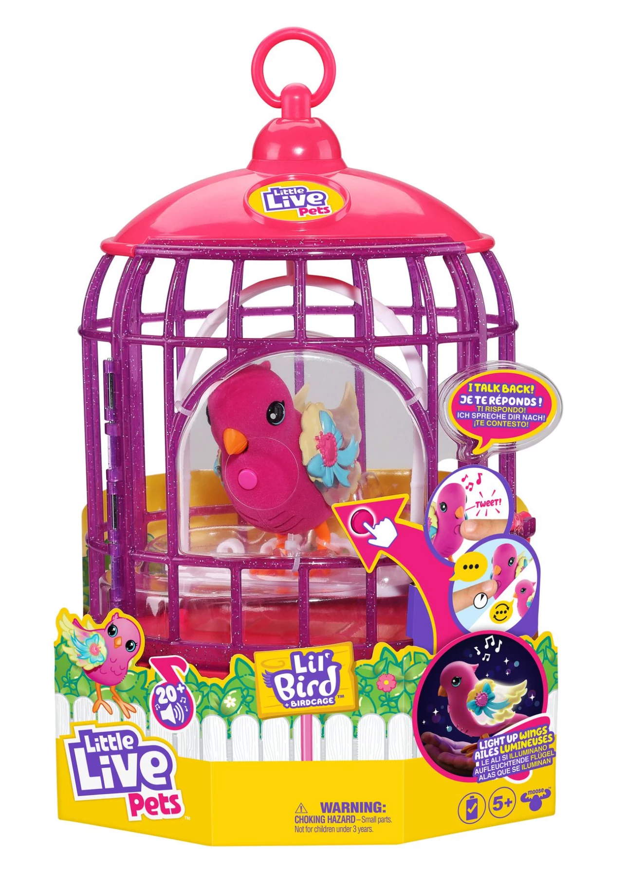 Push the Lil’ Bird’s talk button on its chest and say your message. Your Lil’ Bird will repeat what you say! These vibrant birds will brighten your day with over 20 bird songs to sing! This season your Lil’ Bird has magical light up wings! This Lil’ Bird lives in her own cute Bird Cage! The Bird Cage can sit on its stand or hang from its hook. Each Lil’ Bird has decorations and features on their wings and faces that relate to various themes. Collect them all to form your own fabulous flock!