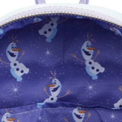 Glide along a shimmering frozen wonderland with Olaf on this Disney Frozen Princess Castle Mini Backpack. On the front, Olaf slides on the ice in front of the sparkling palace, which rises up over the top of the backpack and glimmers with iridescent silver foil detail. On the back, Elsa, Anna, Kristoff, and Sven make an appearance. This accessory complements any Disney outfit and is perfect for fans who are looking to keep their favourite animated moments close. Backpack features include shiny silver hardware, adjustable straps, side pockets, vegan leather (polyurethane), an enamel zipper charm, and applique, iridescent foil, and printed details. Note the coordinating lining. This backpack is an officially licensed Disney product. Backpack dimensions: W 22.8 cm x H 26.7 cm x D 11.4 cm (Please note: width is measured across the bottom of the backpack).