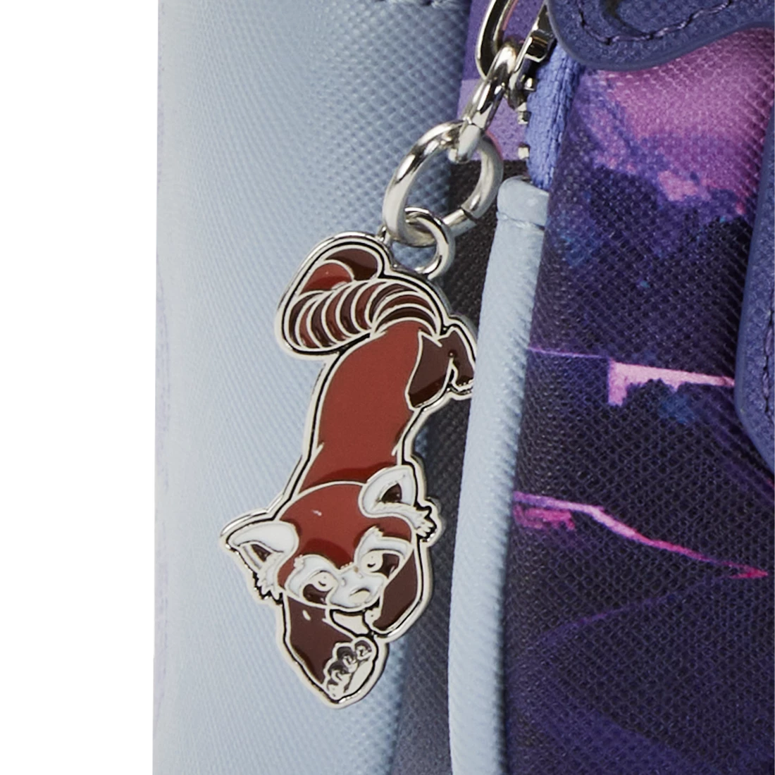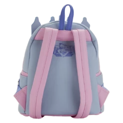 Backpack features include shiny silver hardware, vegan leather (polyurethane), a zipper charm of Pabu, adjustable straps, side pockets, and embossed, debossed, and printed details. Note the coordinating lining.