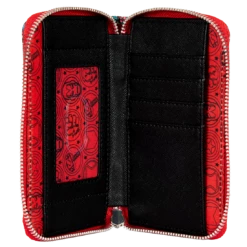 A galactic star pattern serves as a background. It’s the perfect accessory for carrying your valuables in superhero style. Wallet zips closed and features include shiny silver hardware, vegan leather (polyurethane), four card slots, a clear sl