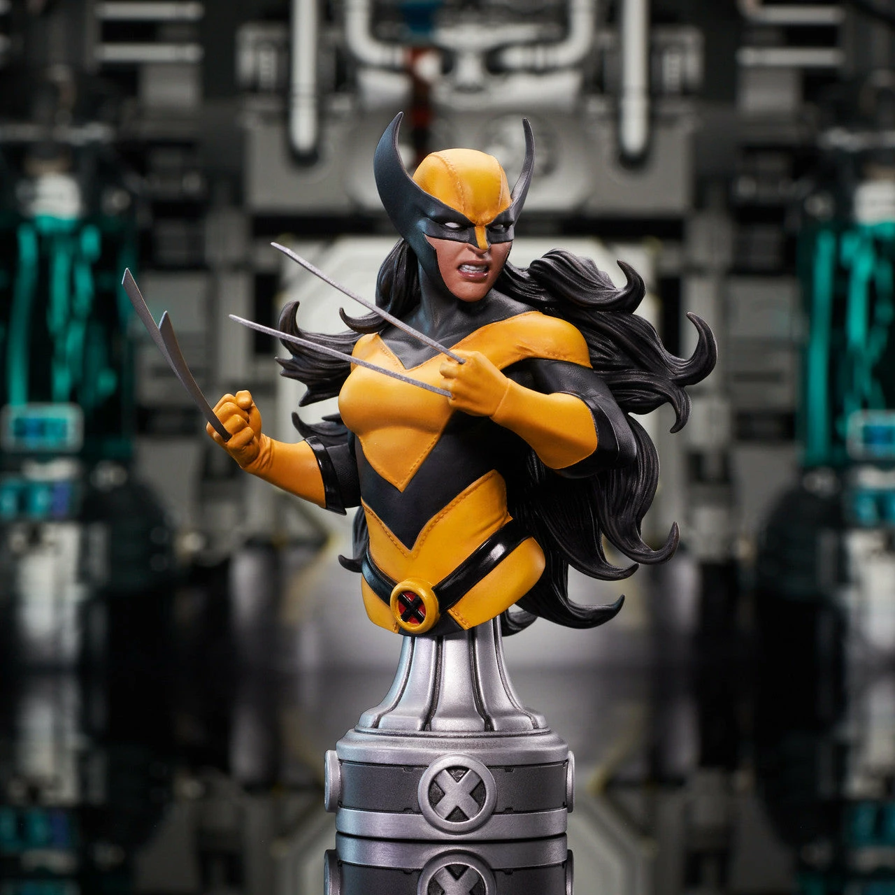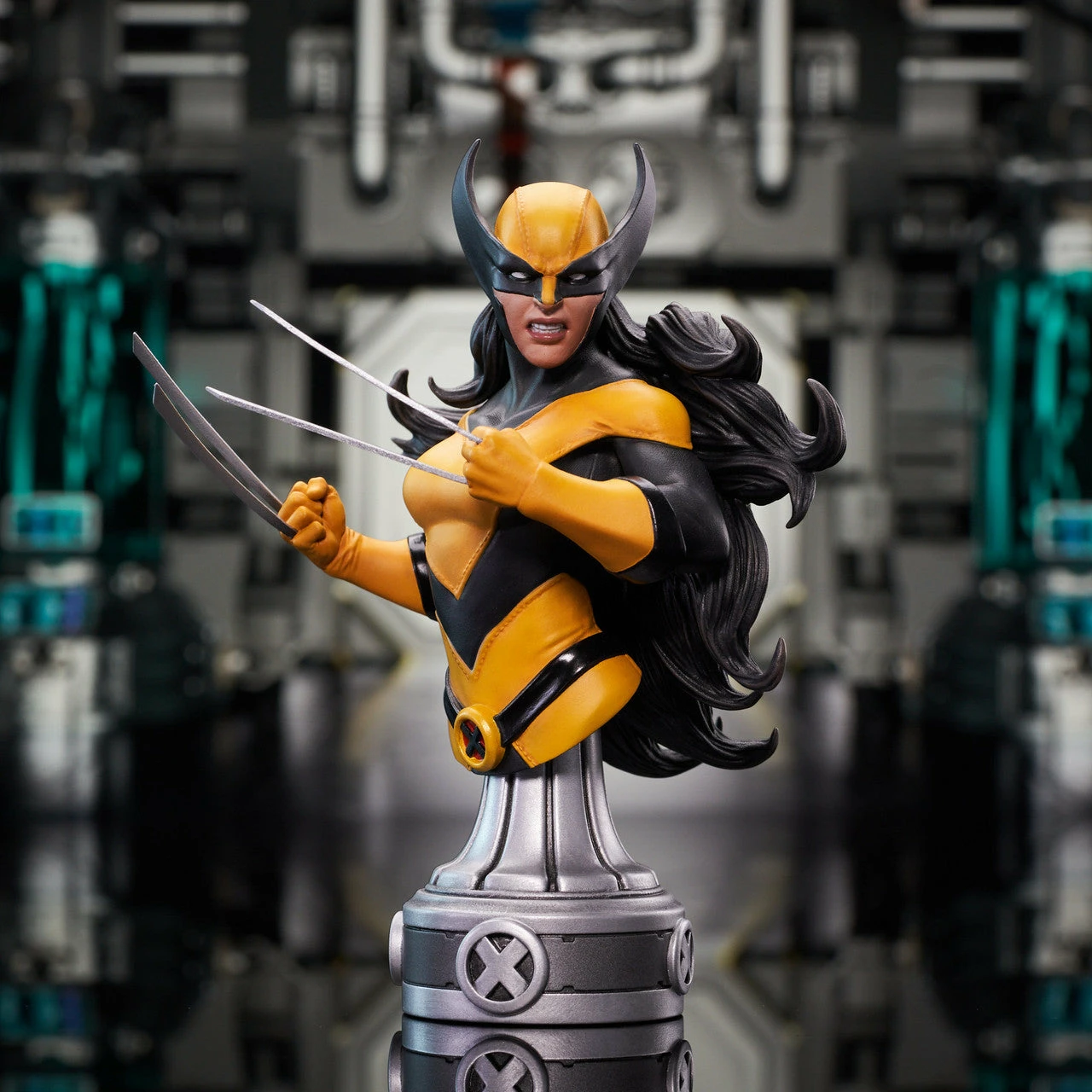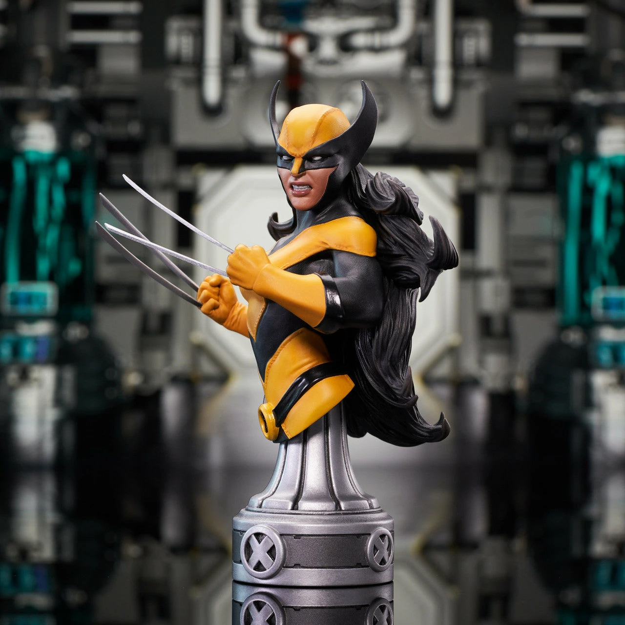 Like father, like clone! The all-new Wolverine gets an all-new bust in the 1/7 scale mini-bust line from DST! Laura Kinney, a.k.a. X-23, wears her new comic-based Wolverine costume and flashes her twin claws in this beautiful new 6 inch-tall sculpture, atop an X-Men logo base. Limited to only 3000 pieces, it comes packaged in a full-color box. Designed by Nelson X. Asencio, sculpted by Juan Pitluk!