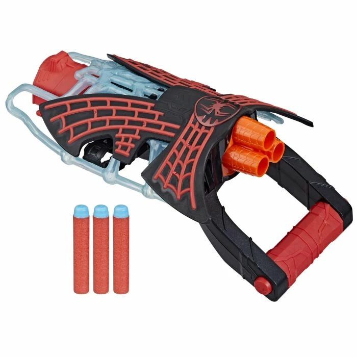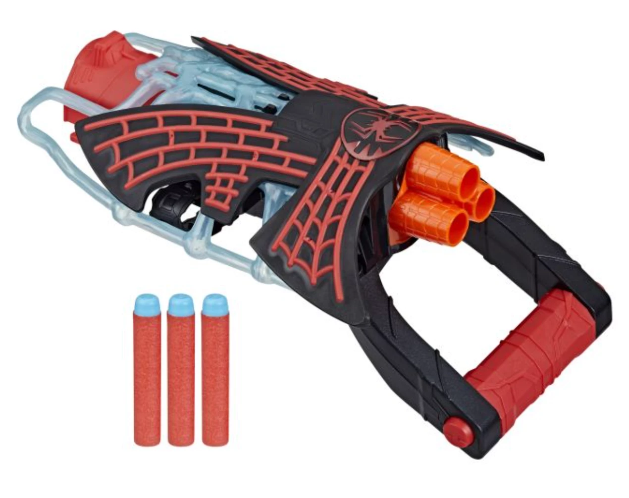 - This Miles Morales Tri-Shot Blaster roleplay toy features design and detail inspired the Spider-Man: Across the Spider-Verse movie