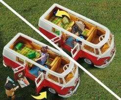 Figures: 1 woman, 1 man; Accessories: 1 Volkswagen T1 Camping Bus, 1 luggage rack, 1 suitcase, 1 travel bag, 1 map, 1 camera with strap, 2 pillows, 1 bottle, 2 cups, 2 toothbrushes, 1 hairbrush, 1 tube, 2 cans of food, 1 bread box, 2 tetra packs