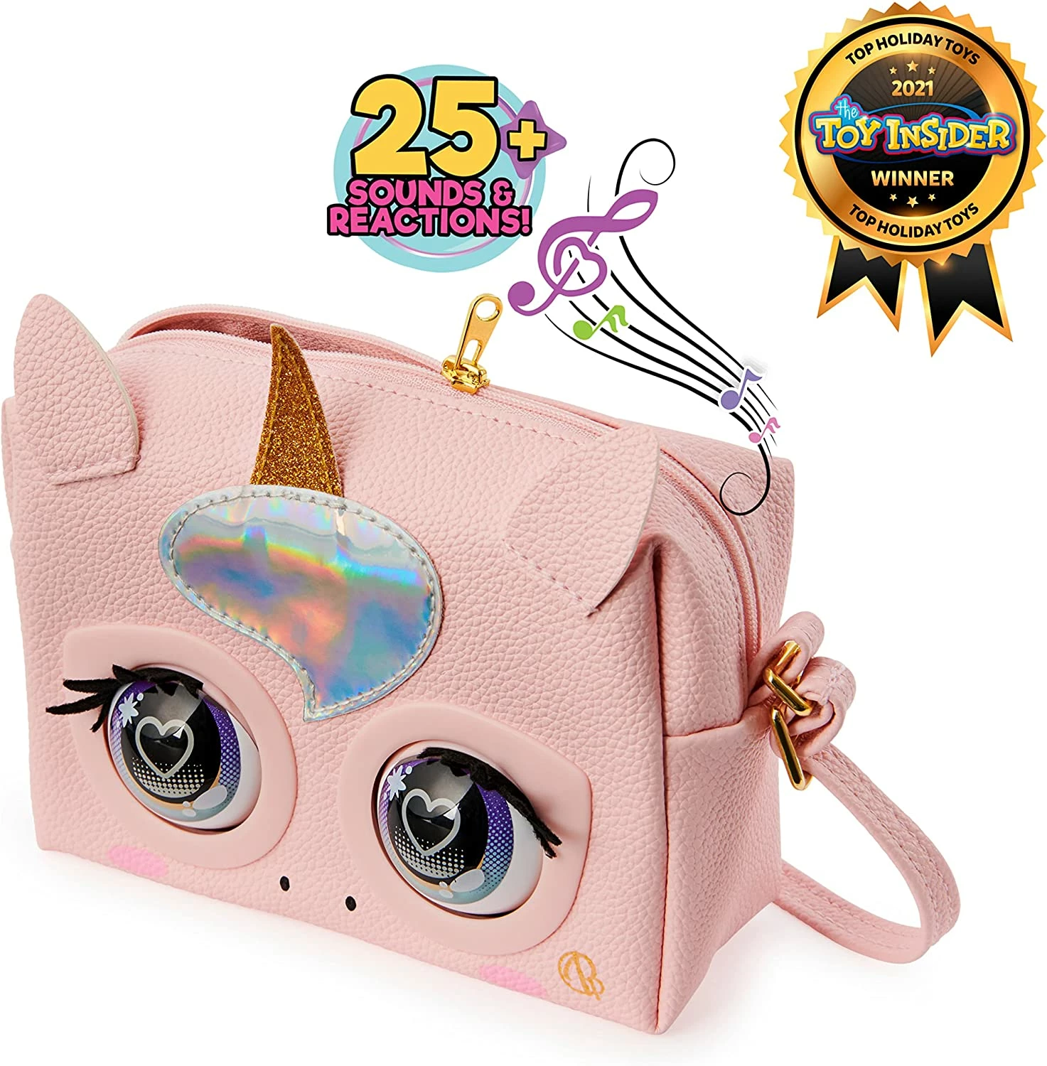 Bring your look to life with Purse Pets! These fabulous interactive pets are packed with purse-onality. They respond to your touch, really blink, and have over 25 exciting sounds and reactions unique to each Purse Pet’s style! The Glamicorn Purse Pet features a glittery horn, iridescent patent leather, pink pebbled faux leather, pop art-inspired eyes, an adjustable strap and real metal hardware. While you’re out and on-the-go, your Glamicorn Purse Pet will blink and make sassy sounds as she interacts with you!