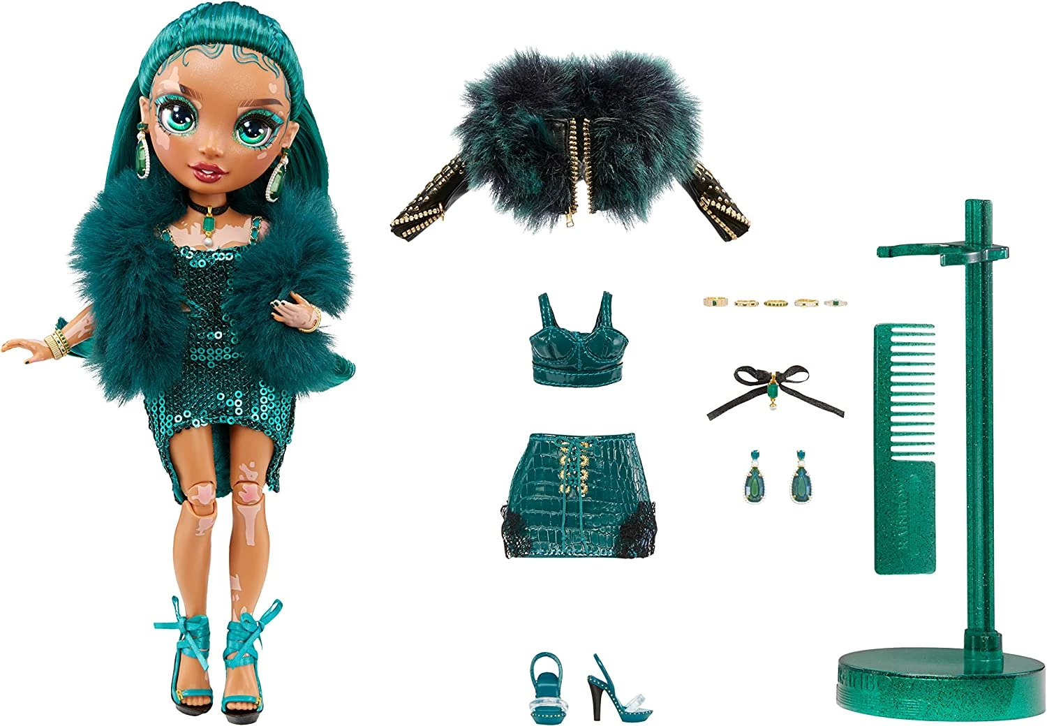 GORGEOUS FEATURES: Jewel Richie has a unique design & our first doll with Vitiligo. Dressed in EMERALD GREEN from head to toe. She has gorgeous detailed features in her fashion, beautiful straight hair with hair rings, long eye lashes & glass eyes.