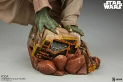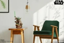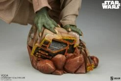The polystone Yoda Legendary Scale Figure features a mixed media costume application, with detailed inner and outer fabric robes that include wiring in the hem for dynamic draping and movement. Yoda’s portrait also features a synthetic hair element giving the diminutive Jedi Master his signature wizened appearance. Sculpted in great detail to bring his distinct look to life, Yoda is crafted with wrinkles, yellowed claws, and soft blushes of red in his ears and cheeks that give this incredible Star Wars statue added depth and realism.
