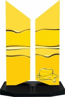 The Premium BTS Logo: Butter Edition features a wrap-around pattern of yellow and black layers of dripping butter. On one side of the statue is the ARMY symbol, right behind the BTS logo, which brings together past and present in one elegant design.