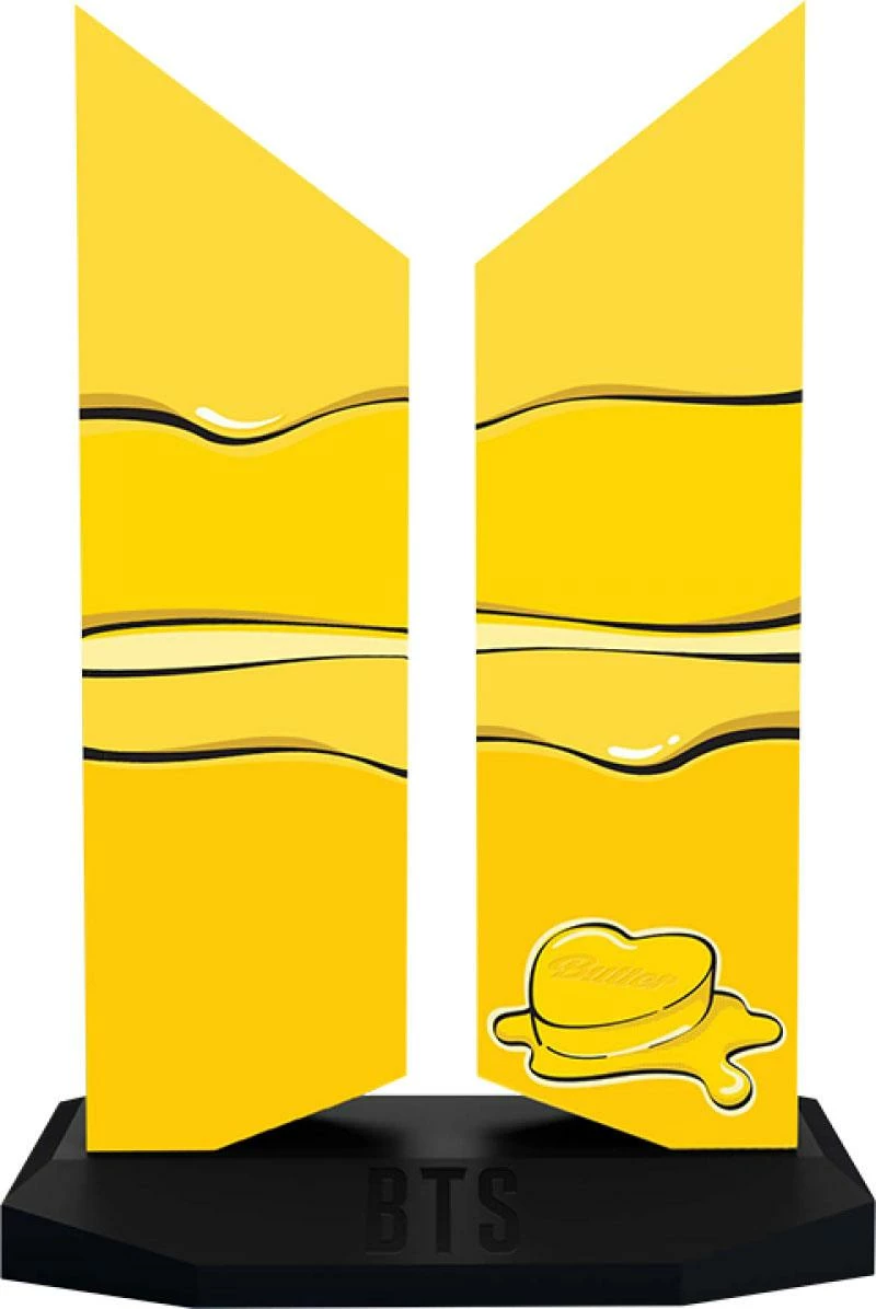 Measuring 7” tall and 4.5” wide, the Premium BTS Logo: Butter Edition takes the iconic shape of the 21st-century pop icons’ logo, visualized as a set of doors opening outward to possibility, and incorporates the smooth aesthetic of BTS’ “Butter” imagery. Melting in the corner is a heart shape complete with the word “Butter” in sweet yellow script.