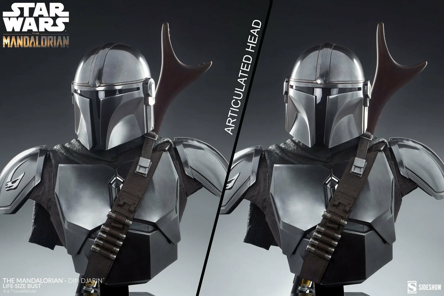 The Mandalorian – Din Djarin Life-Size Bust measures 33.5” tall and 27” wide as he remains vigilant searching for his next target. With rotational articulation in the helmet, collectors can directionally change his focus for added storytelling in any display. His sleek silver armor and costume elements are fully sculpted, recreating his now-iconic silhouette in fiberglass design. Din Djarin’s chest armor, helmet, bandolier, and even cape bear details of weathering and distress accumulated in his dangerous travels. Finally, his right shoulder pauldron features the unique mudhorn™ signet bestowed upon him by the Armorer™. For those who walk the Way of the Mandalore™, this is a must-have centerpiece in any galactic display.