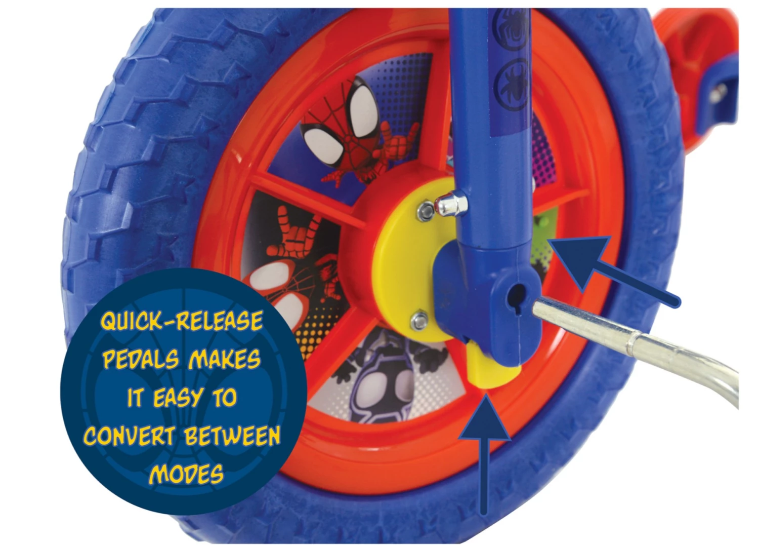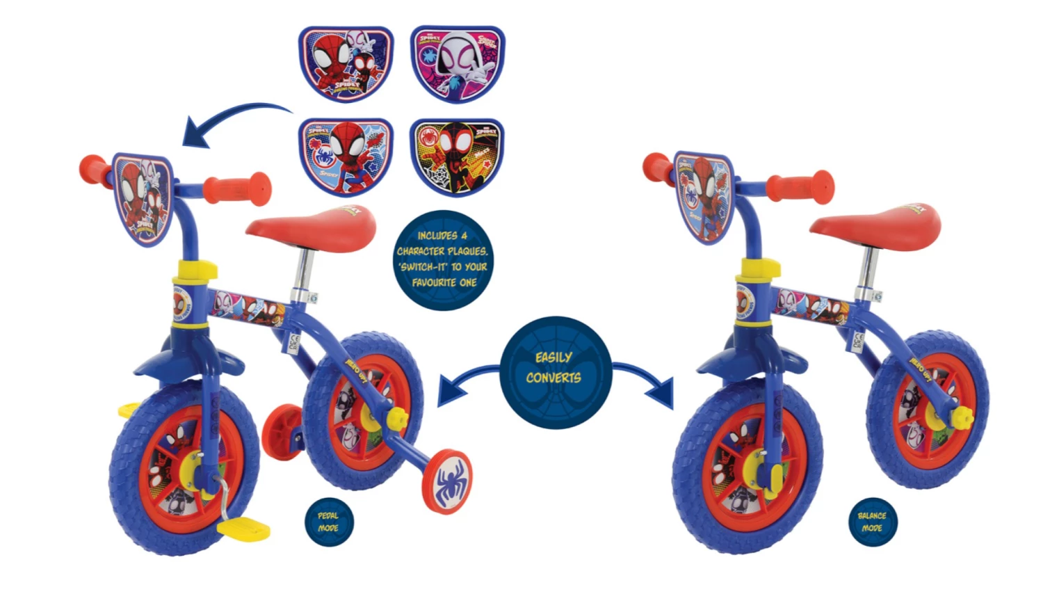 With colourful character graphics, the 2-in-1 converts easily from a training to a balance bike in a matter of minutes. Stage one is the pedal bike where riders can get used to pedalling and steering with the aid of rear stabilisers.