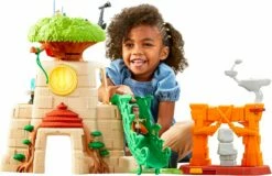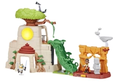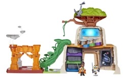 - Features two sides to play and is packed with fun features such as a vine slide, classroom, sleep quarters, a swinging vine, and force push panels