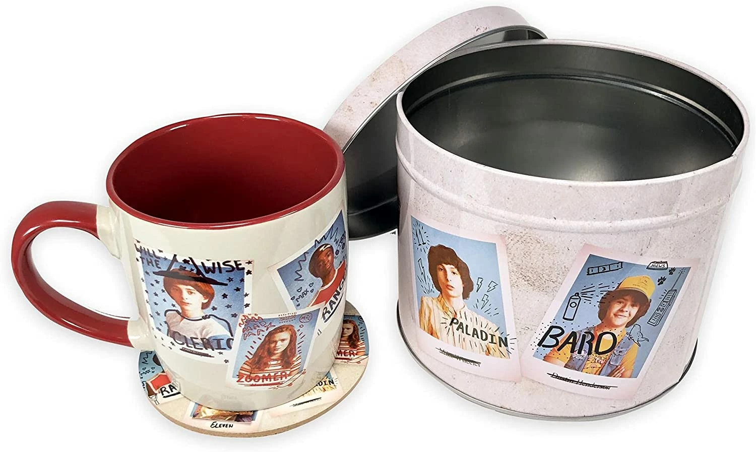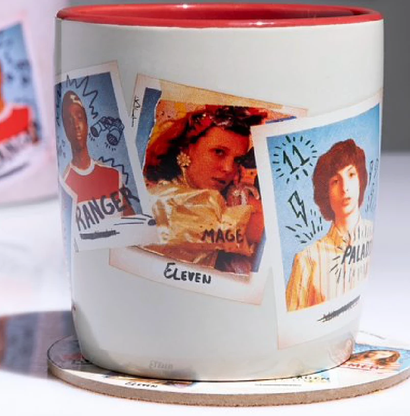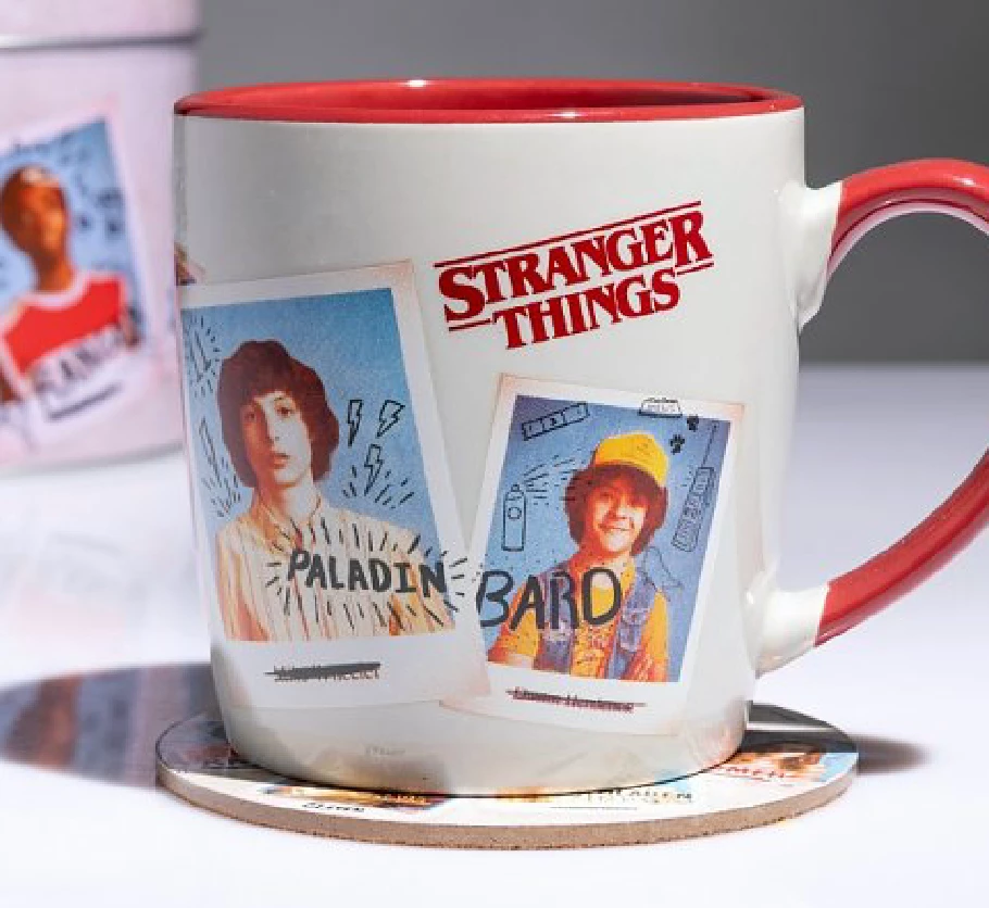 This awesome Stranger Things mug features funky 80s-style polaroid pics of the ST crew and comes with its own matching cork-backed coaster and handy storage tin. We love the doodles on the pics referencing the gang’s Dungeons and Dragons aliases, total geek heaven.
