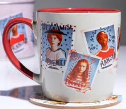 - Ceramic mug with vinyl-coated, cork-backed coaster